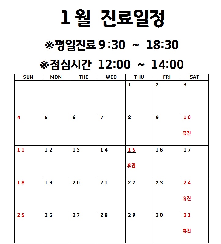 2026년 1월 진료일정입니다(15일(목)휴진)